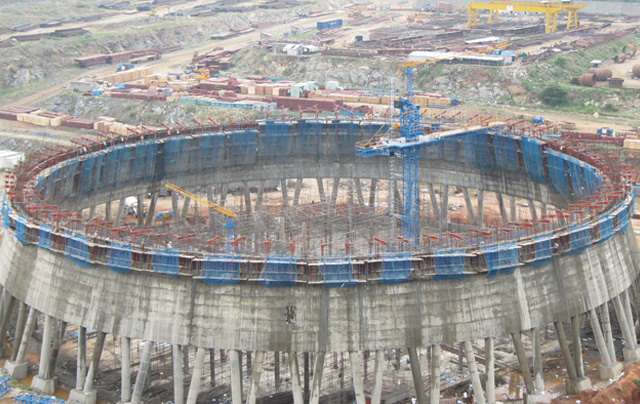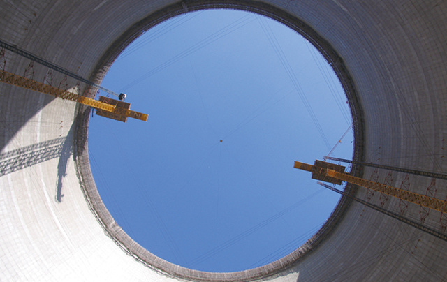 該機(jī)是冷卻塔施工的專用設(shè)備,與升降機(jī)配合使用,頂部塔機(jī)可以吊運(yùn)鋼筋,塔身為升降機(jī)提供附著支撐,水平吊橋?yàn)槭┕と藛T和物料提供平臺(tái)。