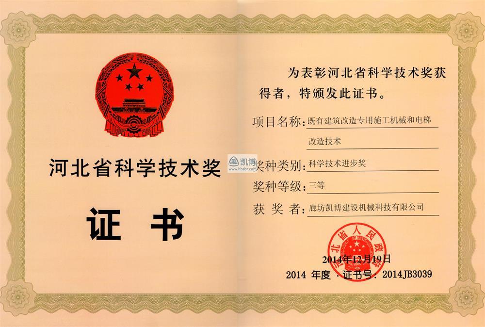 河北省科學技術獎三等獎 既有建筑改造施工機械和電梯改造技術