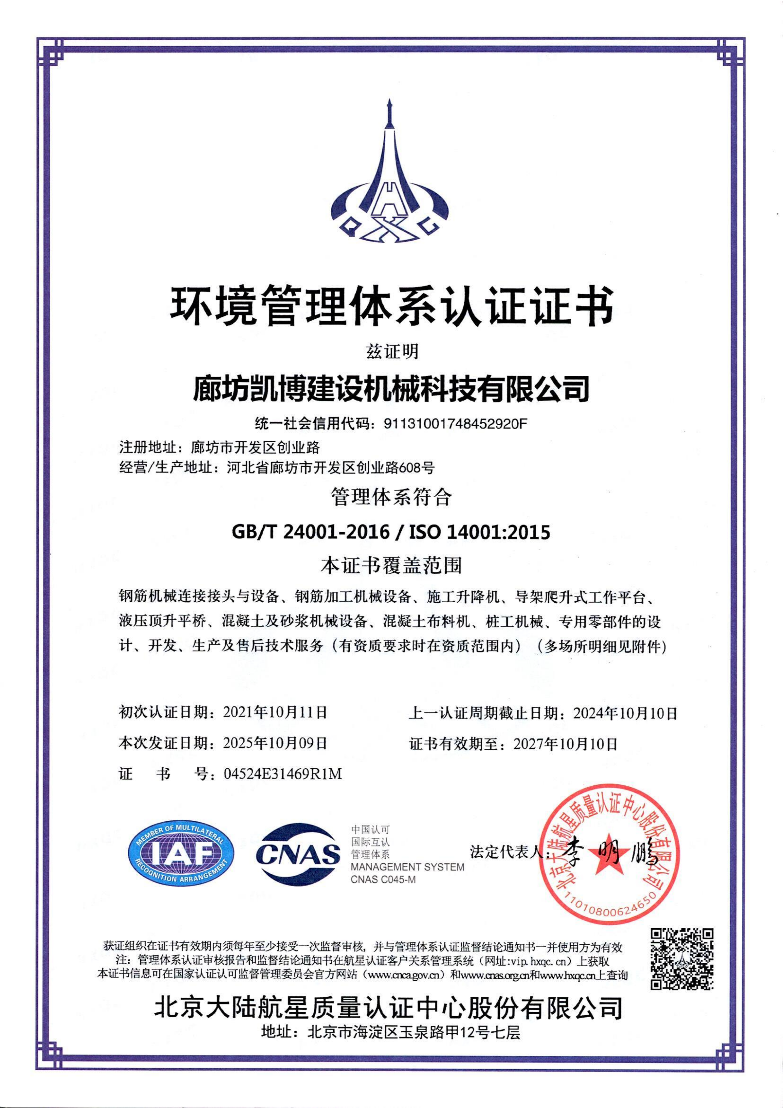 環境管理體系認證證書