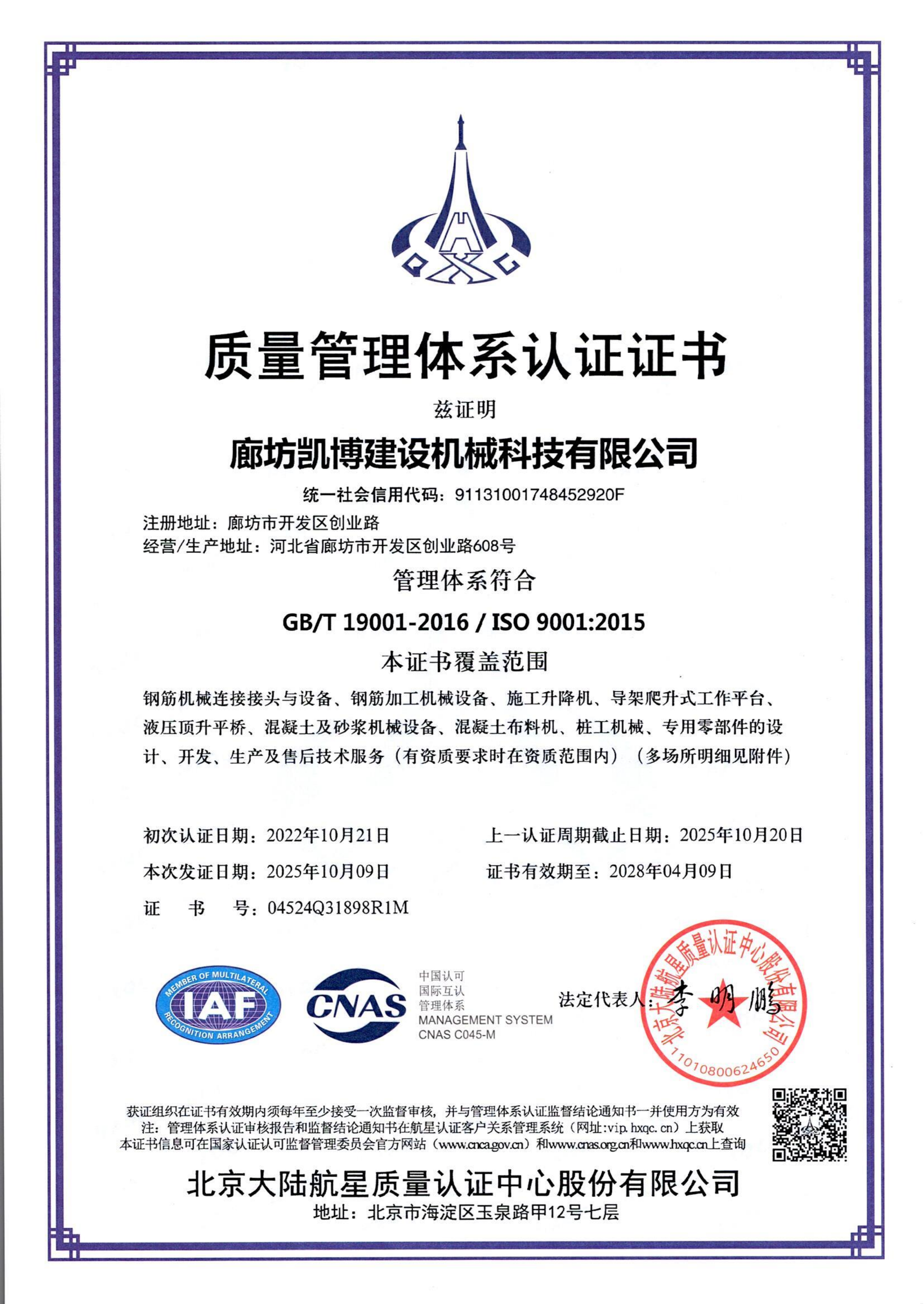 質量管理體系認證證書